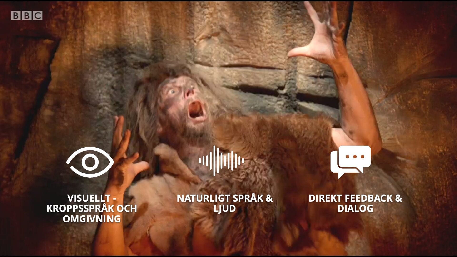Problemet är att detta sätt att kommunicera inte på något sätt är naturligt för oss. Vi har inte genetiskt förändrats på de ca 150 år som allmänheten varit skriv och läskunniga. Det är därför fenomen som ”information overload” finns. Vårt medvetna sinne kan bara ta in 40 bitar information i sekunden. Vi är helt enkelt inte skapta att sitta med näsan i böcker eller framför en skärm och inhämta information genom att skrolla sida upp och sida ned med text. Däremot är vi ungefär likadana som vi var för 50 och 100 000 år sedan. När vi kommunicerade via alla våra sinnen och använde vårt undermedvetna till att ta in och processa enorma mängder information i vår omgivning, närmare två miljoner bitar i sekunden jämfört med vårt medvetna sinnes 40 bitar. Vi behöver kunna kommunicera och ta in information visuellt, såsom kroppsspråk och vad som sker i vår omgivning. Men också förstås med naturligt språk och ljud. Och genom möjligheten att ge direkt feedback och ha en dialog med varandra kan vi snabbt fylla i luckor i kommunikationen och nå ömsesidig förståelse.